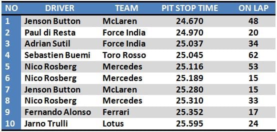 Last year’s winner Sebastian Vettel made the soft tyres last nearly 50 laps and pitted just twice. Though one might argue that he was helped by the red flag conditions towards the end of the race, other drivers like Kamui Kobayashi and Adrian Sutil also made their soft tyres last for more than 45 laps. In fact, Kobayashi and Sutil used the super-soft tyres in which they started for about 34 laps which clearly underlines the fact that the tyres can be stretched up to their maximum limit before they fall off the cliff.